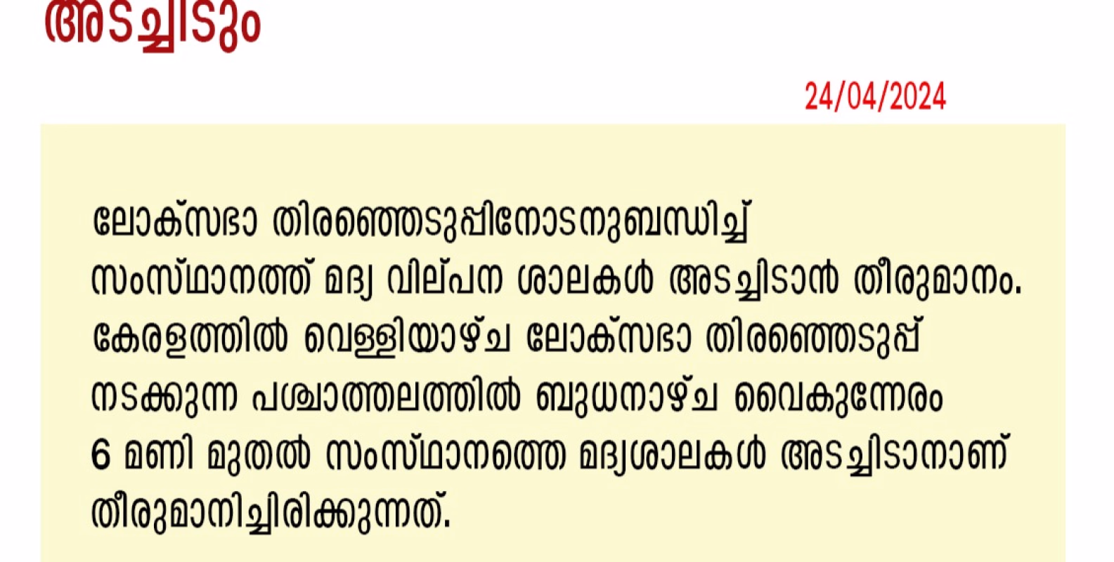 ലോക്സഭാ തിരെഞ്ഞെടുപ്പ് :സംസ്ഥാനത്ത് മദ്യ വില്പന ശാലകൾ അടച്ചിടും