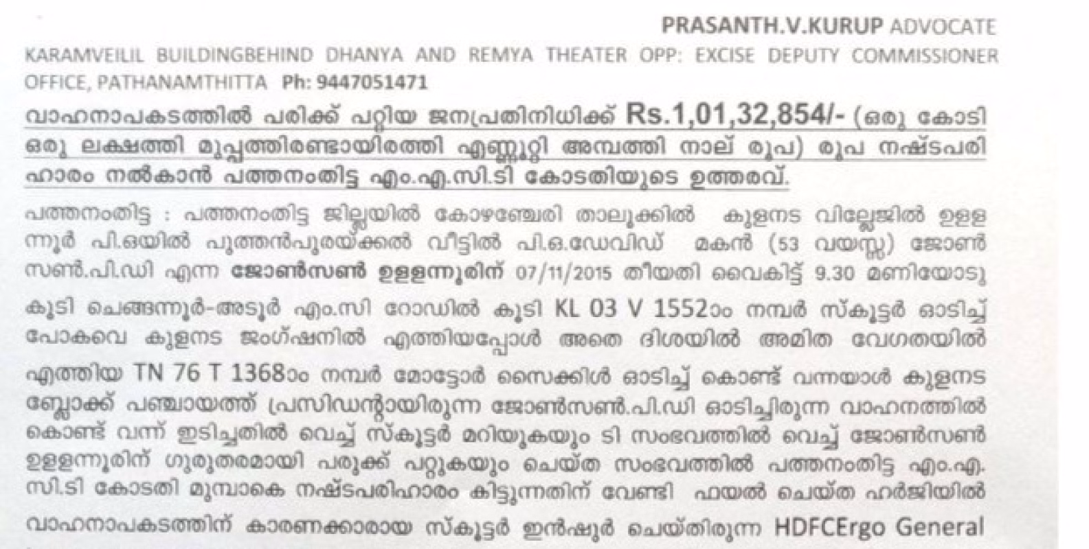 പത്തു വർഷത്തെ നിയമപോരാട്ടം; മുൻ ജനപ്രതിനിധിക്ക് ഒരു കോടിയിലധികം രൂപ നഷ്ടപരിഹാരം